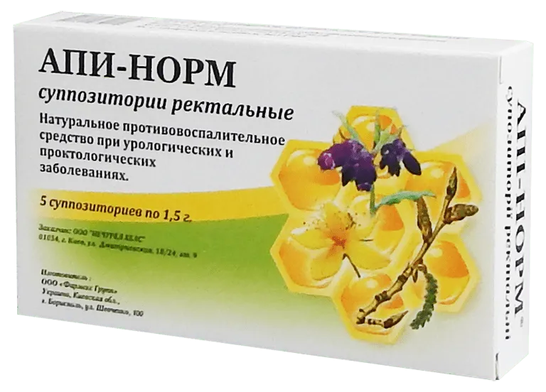 Api-Norm rectal suppositories are typically packaged in a box containing 5 suppositories. Each suppository is individually wrapped to maintain hygiene and product integrity.