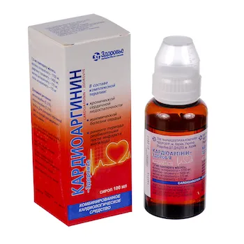 Cardioargynin syrup is packaged in a 100 ml bottle with clear dosage markings. The packaging includes a measuring cup for convenient dosing and detailed instructions for use. The label contains essential information about the product, including its composition and dosage regimen.