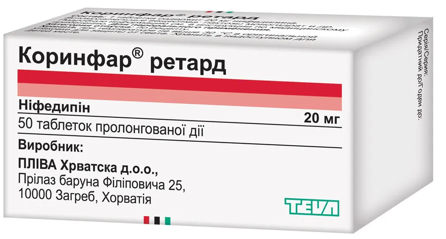 Corinfar (nifedipine) retard tablets with prolonged release 20 mg. №50 vial