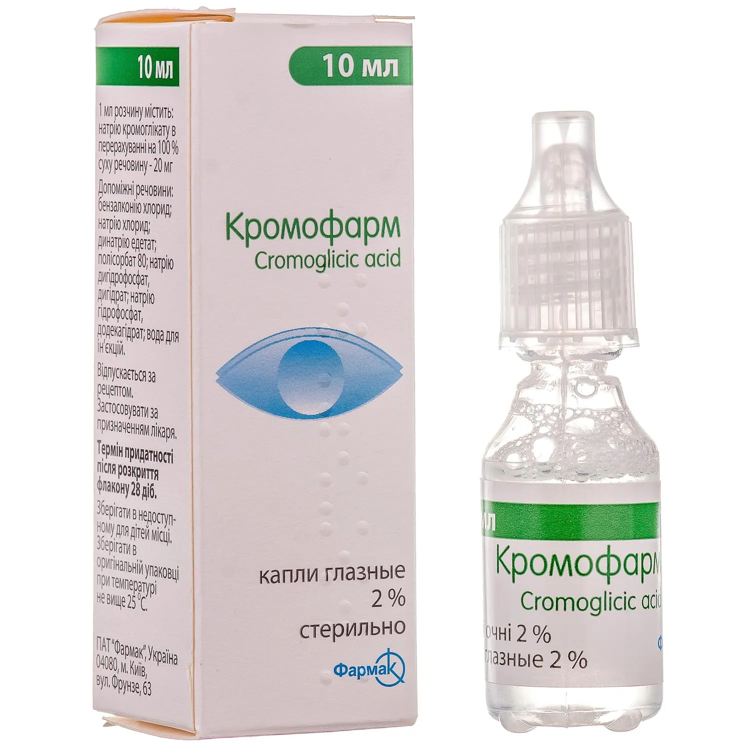 Cromofarm eye drops are available in a 10 ml bottle with a dropper tip for easy instillation. The packaging is designed to maintain the sterility and integrity of the product throughout its shelf life.