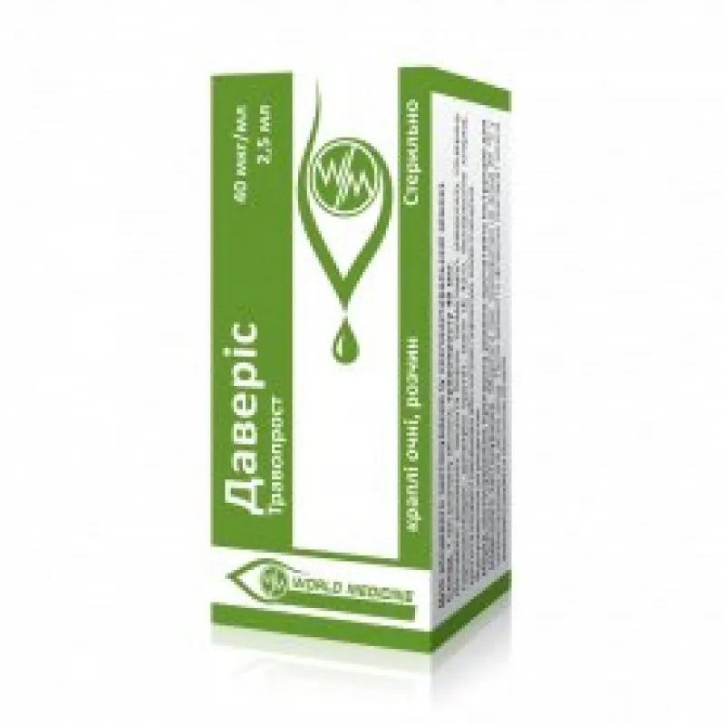 The Daveris eye drops come in a 2.5 ml vial containing a solution of travoprost 40 mcg/ml. The packaging is designed to maintain the sterility and integrity of the product until opened.
