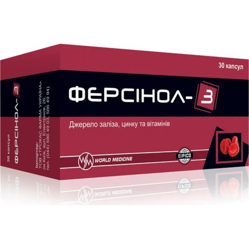 Indications: Fersinol-3 Capsules №30 are indicated for the treatment and prevention of iron deficiency anemia, especially during pregnancy or in individuals with poor dietary intake of iron.