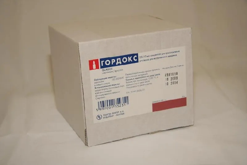 Gordox solution for injections contains the active ingredient gordox in a concentration of 100,000 units per 10 ml ampoule. Other inactive ingredients include sodium chloride, water for injection, and hydrochloric acid for pH adjustment.