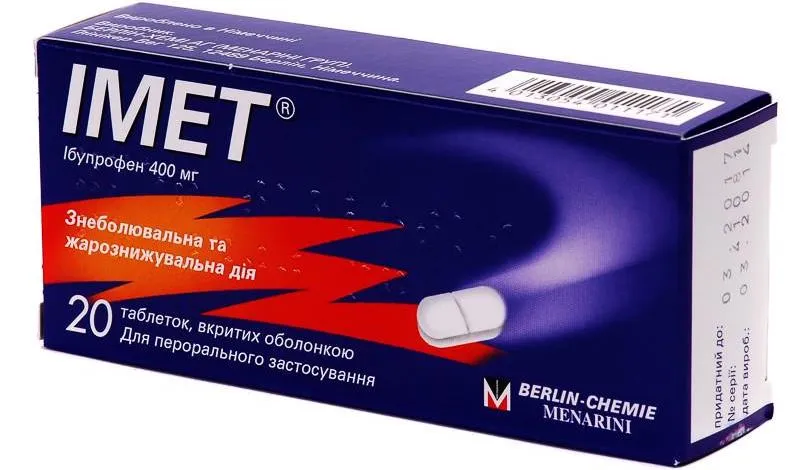 Each coated tablet contains 400 mg of Imet (active ingredient). Other ingredients include microcrystalline cellulose, croscarmellose sodium, magnesium stearate, and hypromellose.