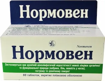 - Normoven (diosmin) coated tablets №60 are indicated for the treatment of chronic venous insufficiency, hemorrhoidal disease, and related symptoms such as heavy legs, pain, and edema.