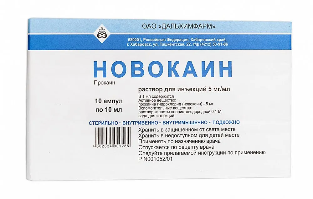 Each ampoule contains 0.5% Novocain (Procaine) solution for injections.